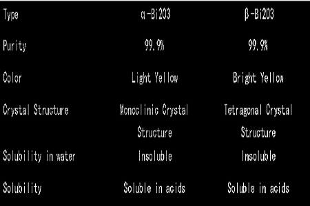Bismuth trioxide has different colors because of different crystal forms. Alpha Bismuth oxide can be heated to become beta Bismuth oxide. After cooling, it turns into Alpha Bismuth oxide. The color changes from light yellow to orange yellow. After cooling, it turns back to light yellow powder. Thus, alpha type Bismuth trioxide is the most stable crystal form.